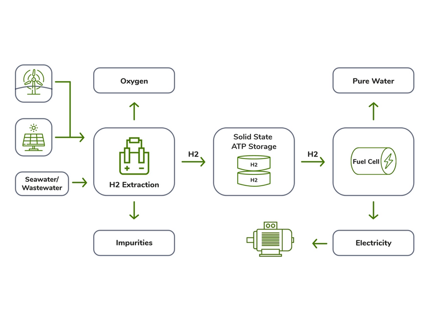 Powered by renewable sources, such as wind and solar, the electrolysis unit extracts green hydrogen from wastewater/seawater and converts it to electricity via a fuel cell.